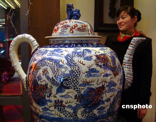 2009年1月2日,一名女士在觀賞景德鎮陶瓷巨壺。近日,一把可供300人同飲的景德鎮陶瓷巨壺在蘇州一家陶瓷商店亮相。據了解,這把陶瓷巨壺高約120厘米,壺身直徑約85厘米。 <