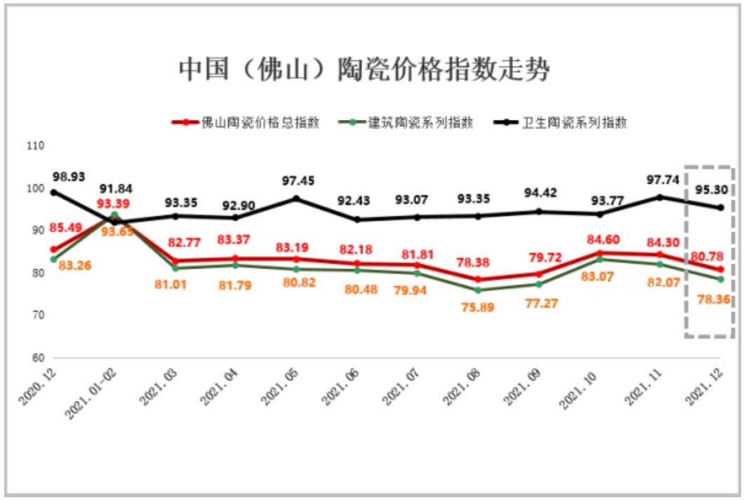 2021年行業運行態勢呈現前暖后冷的特點。主要受三方面原因影響:第一、上半年國內疫情穩定,春節后全國各地市場需求強勁,建材行業呈現出小旺季;第二、2021年是十四五開局之年,上半年的經濟形勢表現出發展小高潮;第三、上半年全球經濟復蘇,外需經濟活躍,外貿訂單爆滿,但隨著下半年海運費的爆漲、疫情的不穩定、原材料漲價等因素影響,企業利潤空間急劇收縮,市場行情低迷下行。佛山陶瓷價格指數全年走勢與行業趨勢相符。