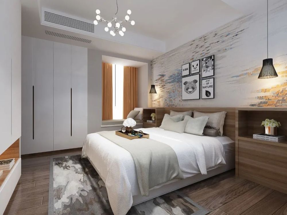 木飾面+乳膠漆:電視墻作為家庭裝修的一個中心位置,單單用乳膠漆可能會顯得有點單調,因此可以適當在電視墻兩側加入木飾面的材質,以對稱的設計與獨特的材質碰撞,也能營造出簡約高級的設計效果。
