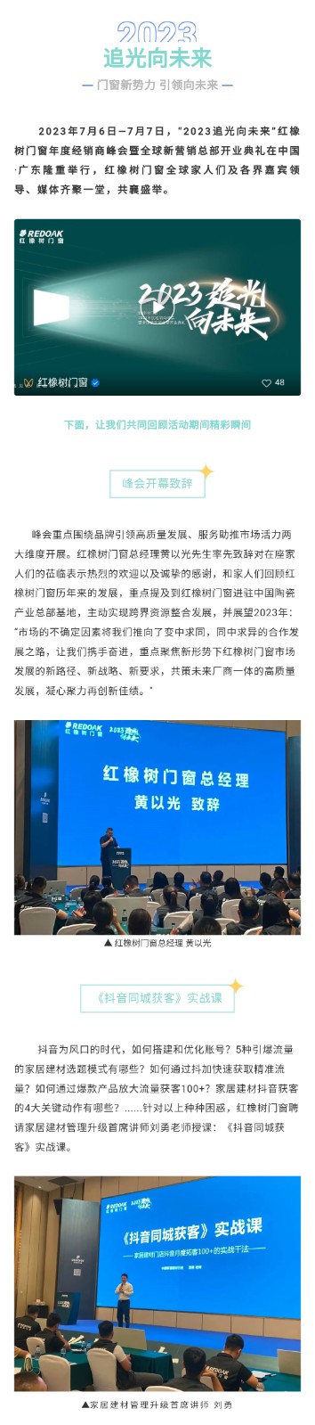 2023年7月6日—7月7日,“2023追光向未來”紅橡樹門窗年度經銷商峰會暨全球新營銷總部開業典禮在中國·廣東隆重舉行,紅橡樹門窗全球家人們及各界嘉賓領導、媒體齊聚一堂,共襄盛舉。