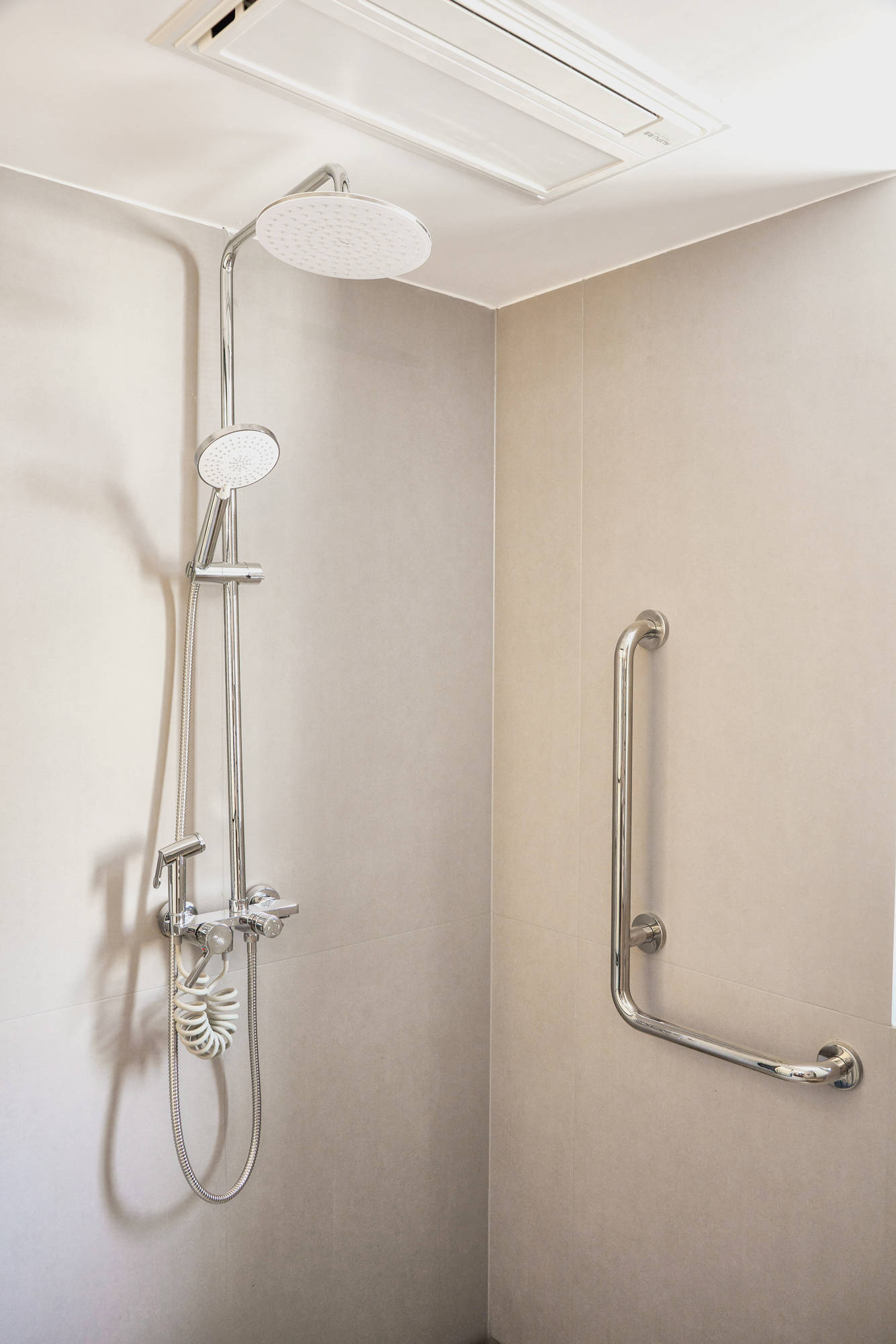 設(shè)計(jì)師對(duì)新房衛(wèi)生間重新布局,借用廚房的一小部分空間,將洗手臺(tái)嵌入墻體,合理劃分出衛(wèi)生間的洗漱區(qū),讓出足夠的空間給如廁區(qū)和淋浴區(qū),并選用鷹衛(wèi)浴智能坐便器、大頂噴花灑,貼心安裝了扶手,不僅有效做到干濕分離,帶來(lái)健康舒適的衛(wèi)浴體驗(yàn),最大化滿足了老年人的生活需求。