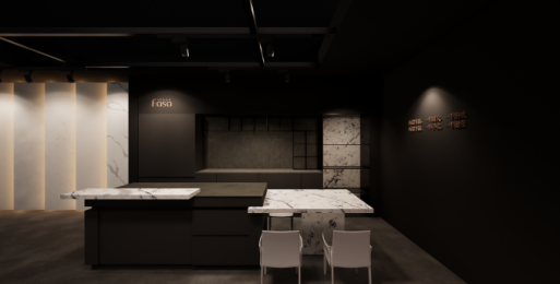 材料語(yǔ)言作為一種共通的設(shè)計(jì)語(yǔ)言,呈現(xiàn)形式有風(fēng)格意義上的選擇性和延續(xù)性,但設(shè)計(jì)的方法卻不曾脫離人類(lèi)對(duì)空間需求的原始基石。法薩展館整體以復(fù)古未來(lái)風(fēng)為主旋律,現(xiàn)代與復(fù)古元素的結(jié)合、色彩明暗對(duì)比、弧形線條與幾何形狀的對(duì)比,以及石英材質(zhì)的運(yùn)用,共同構(gòu)成一個(gè)充滿個(gè)性且引人入勝的餐廚空間。